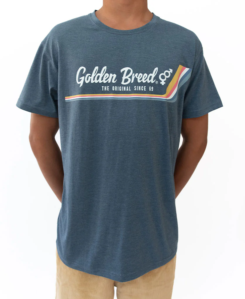 Another classic tee featuring the much loved classic Golden Breed “Brand Stripe” front print on a super soft Marle cotton base.